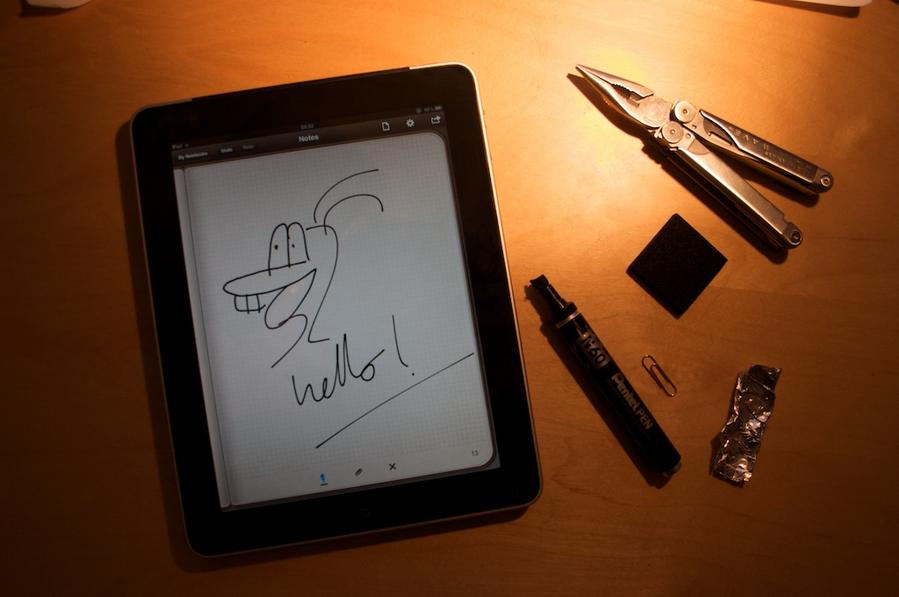 I was really taken by Dan Provost's excellent solution to this - he converted a dry erase marker into a conductive stylus that would work on the iPad screen. In particular, he noted that whilst most styluses try to mimic a pen, the iPad doesn't offer that level of finesse, and in fact has the right affordance for drawing with a marker pen - something I thought was spot on.